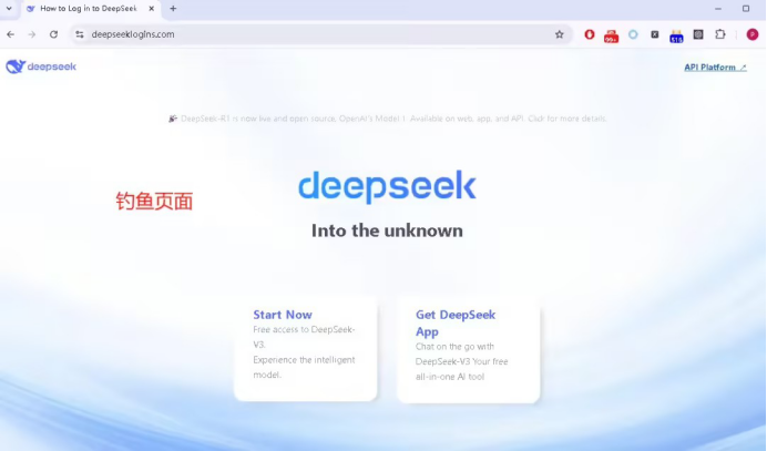 以釣魚網(wǎng)站“https://deepseeklogins.com/”為例,其頁面結(jié)構(gòu)和風(fēng)格與 DeepSeek 官方網(wǎng)站高度相似,旨在通過偽造官方頁面來誘導(dǎo)用戶泄露敏感信息。與真實網(wǎng)站相比,釣魚頁面移除了中英文切換的超鏈接。在該釣魚頁面中,點擊右上角的“API Platform”鏈接將會引導(dǎo)用戶跳轉(zhuǎn)到偽造的登錄頁面。